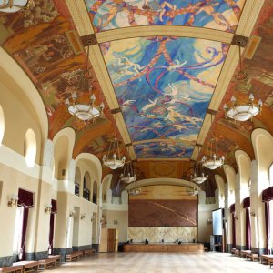 Mis en scène de manière éclatante avec un décor inspiré des quatre saisons complété par des panneaux de staff, des ferronneries et des luminaires, le style Art déco forme ici un ensemble cohérent et fastueux. La peinture de la partie centrale du plafond, objet d'un concours distinct remporté par Octave Guillonnet, représente des rondes de figures volantes sur un fond bleu azur, entourant les armoiries de la Ville de Paris, dans les lumières féériques d'une fête.
