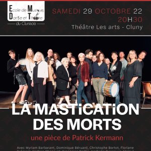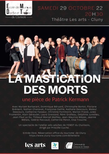 2022-10-29 20:30:00 2022-10-29 22:30:00 Europe/Paris La mastication des morts Reservations on : https://www.cluny-tourisme.com -- Une pièce de Patrick Kermann   L'école de Musique, Danse et Théâtre du Clunisois est heureuse de vous présenter le spectacle de l'atelier ado-adultes dirigé par Priscille CUCHE.   Les élèves vous présenteront une pièce de Patrick Kermann, "un oratorio in Progress"   Ce spectacle est déconseillé aux moins de 14 ans. Théâtre Les Art - Cluny Ecole de musique, danse & théâtre du Clunisois