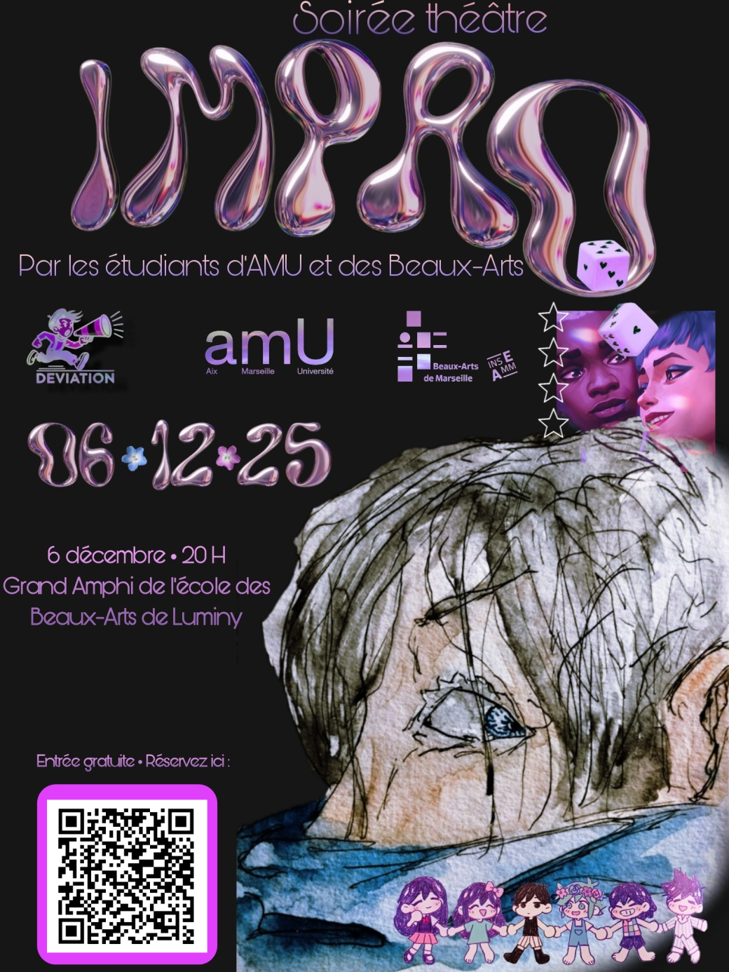 Pour clôturer les ateliers de ce premier semestre, les étudiants vous invitent à une soirée placée sous le signe de l’improvisation ! Et c’est vous, cher public, qui aurez le pouvoir de déterminer le thème de chaque impro !