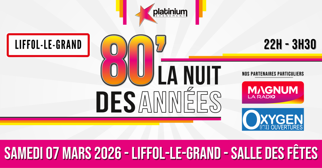 Organisé par PLATINIUM EVENEMENT en partenariat avec MAGNUM LA RADIO & OXYGEN OUVERTURES, préparez-vous à une soirée inoubliable qui vous replongera dans l’âge d’or des années 80 : paillettes, tubes légendaires et ambiance survoltée au programme !