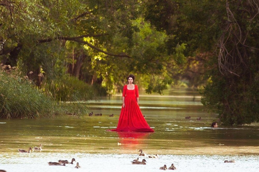 Violette Prevost con su largo vestido rojo, pondrá a flote su nuevo espectáculo de piano, canción, danza y percusión.