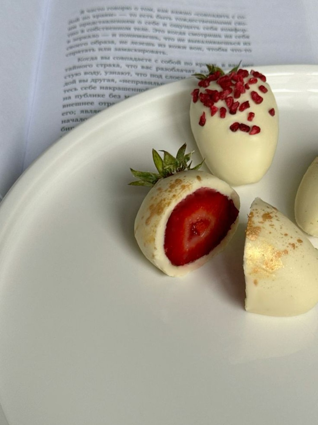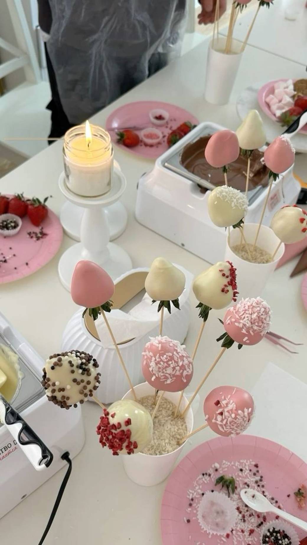 Elle la remplit de fraises fraîches (si disponibles, autre fruits disponible, si cas d'allergies merci de me prévenir pour adapter), puis les personnalise en les trempant dans du chocolat fondu.