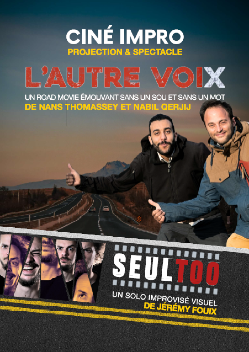 À partir de vos propositions, Jérémy (et peut-être Nans…?) improvisera un road movie théâtral sans paroles, porté par les regards, les gestes, les silences et la musique.