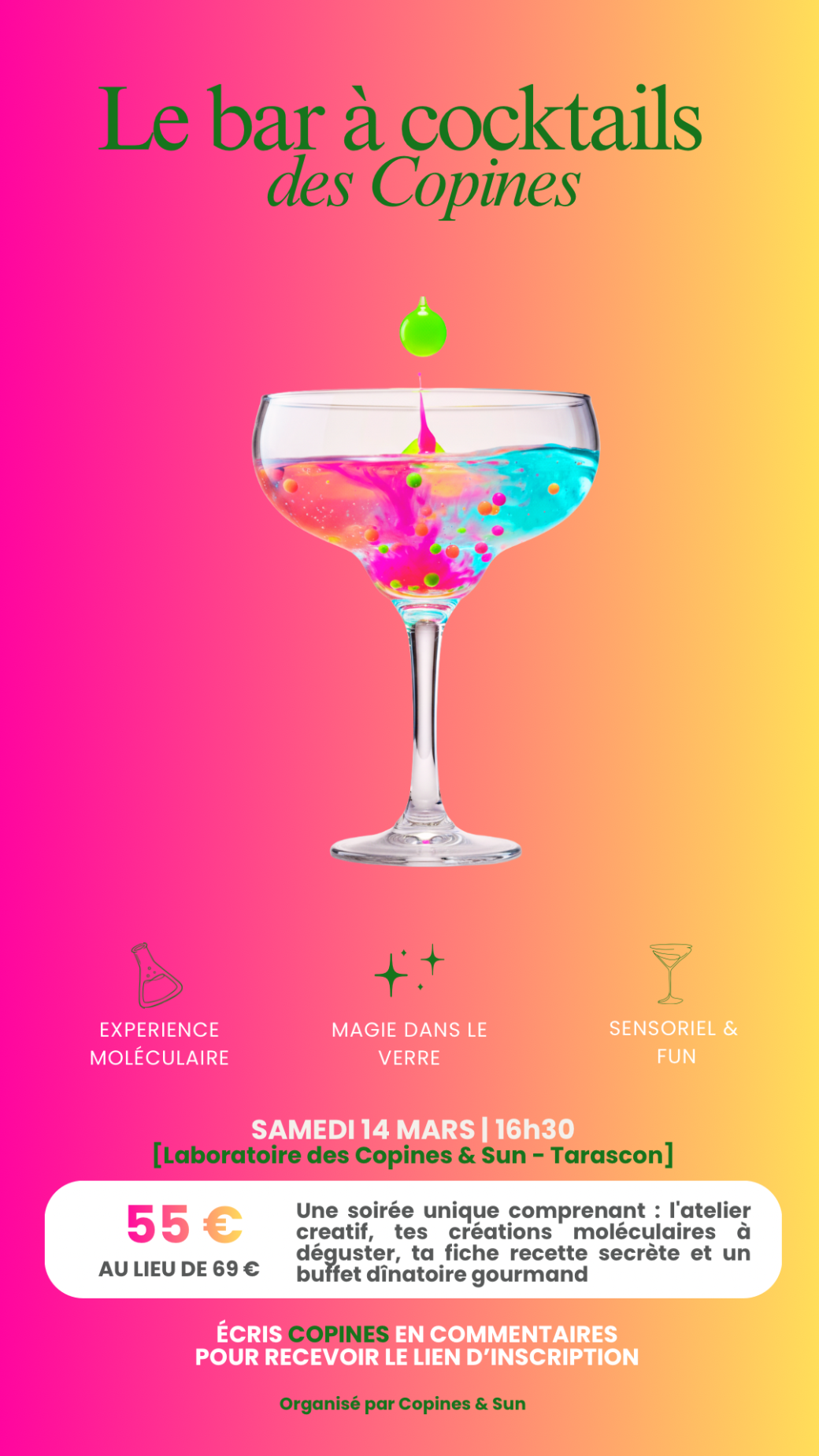 Bienvenue au Bar à Cocktail des Copines, une soirée immersive organisée dans mon laboratoire à Tarascon.