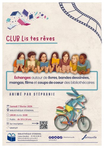 2026-02-07 14:30:00 2026-02-07 16:00:00 Europe/Paris le club "Lis tes rêves" Reservations on : https://www.boucledesmediatheques.fr/Sartrouville -- Échanges autour de livres, bandes dessinées, mangas, films et présentation de coups de coeur des bibliothécaires.   De 10 à 14 ans   Gratuit sur Inscription Bibliothèque Stendhal, Rue Saint-Exupéry, Sartrouville, France Bibliothèque Stendhal
