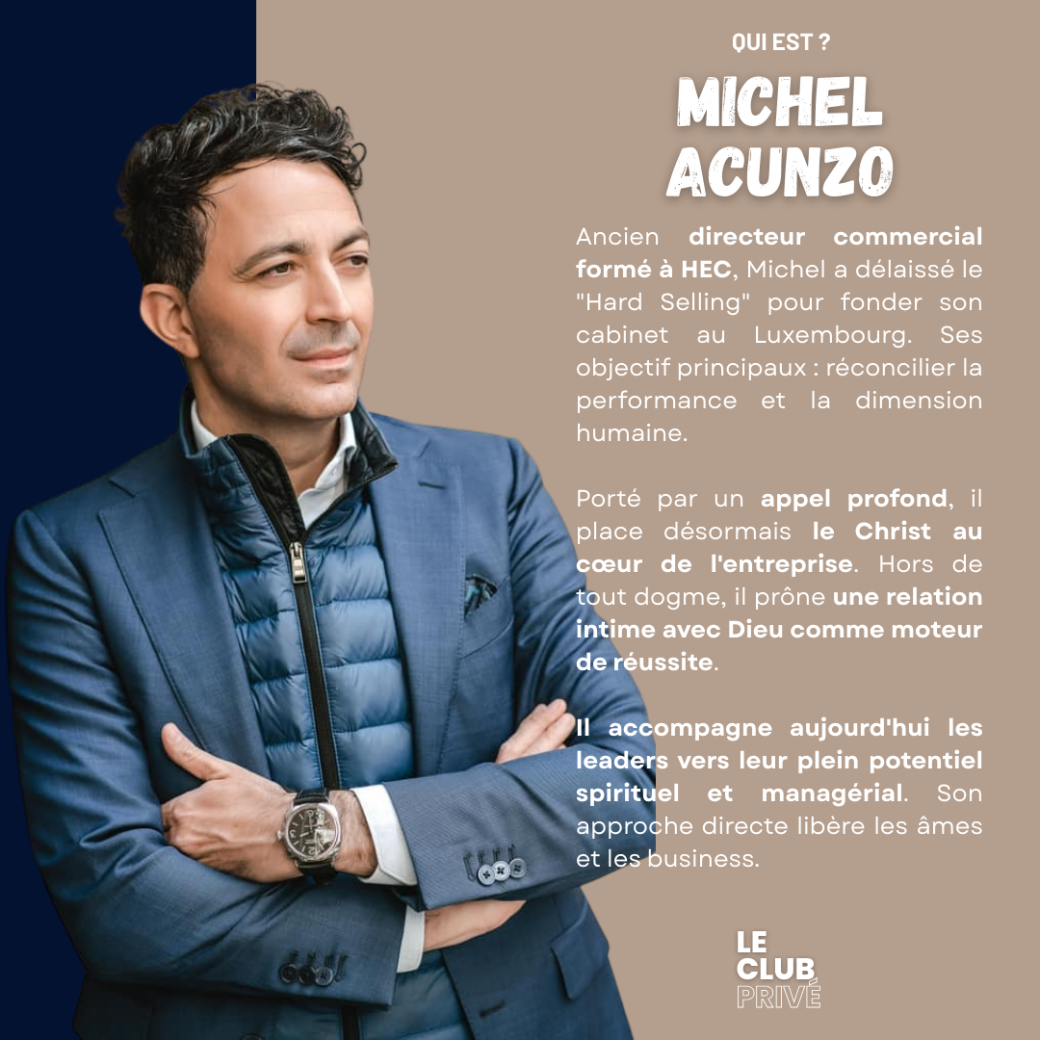 Michel : Expert formé à HEC et ancien directeur commercial, il accompagne aujourd'hui les leaders vers leur plein potentiel spirituel et managérial en replaçant le Christ au cœur de l'entreprise.
