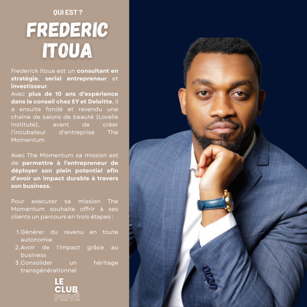 Frederick Itoua : Consultant en stratégie (ex-EY, Deloitte) et serial entrepreneur, il est le fondateur de l’incubateur The Momentum, dédié à la création d'impact durable et d'héritages transgénérationnels.