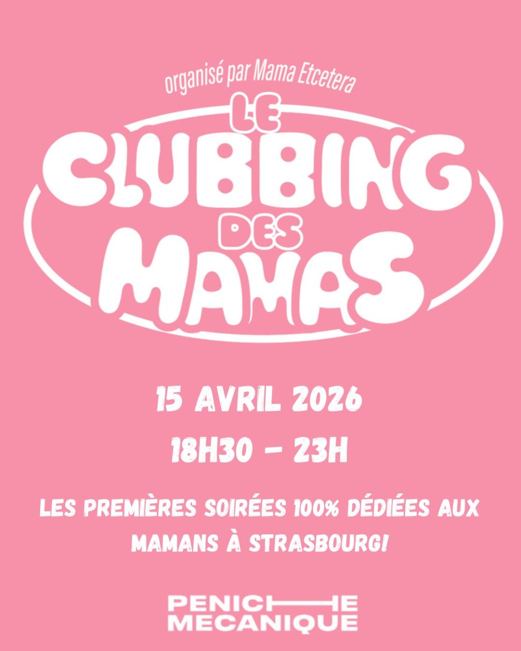 2026-04-15 18:30:00 2026-04-15 18:30:00 Europe/Paris Le clubbing des mamas - 15 avril Reservations on : https://www.billetweb.fr/le-clubbing-des-mamas-15-avril --  LE CLUBBING DES MAMAS   Une vraie soirée clubbing… mais en début de soirée ! Parce qu’on veut danser, s’éclater, trinquer avec les copines, mais sans rentrer à 3h du mat’ comme avant (et payer le prix fort le lendemain).   * DJ set 1990-2015  * Dancefloor ouvert dès le début de soirée  * Bar et petite restauration sur place  * Drag Show avec Anissa Benma Marley et Arï Meyde Marley * Maquillage et paillettes!   Ambiance bienveillante garantie!   RDV à la Péniche Mécanique de 18h30 à 23h !   ---------------------- Soirée en non mixité, seules des femmes sont invitées à participer, les hommes, même munis d'un billet se verront refuser l'entrée.   Peniche Mecanique, Presqu'île André-Malraux, Strasbourg, France Kids Event Alsace