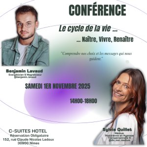 Lors de cette conférence interactive, Sylvie Quillet (Médium & Praticienne en Hypnose transpersonnelle ®) et Benjamin Lavaud (Magnétiseur & Energéticien) vous proposent une exploration du cycle de la vie :