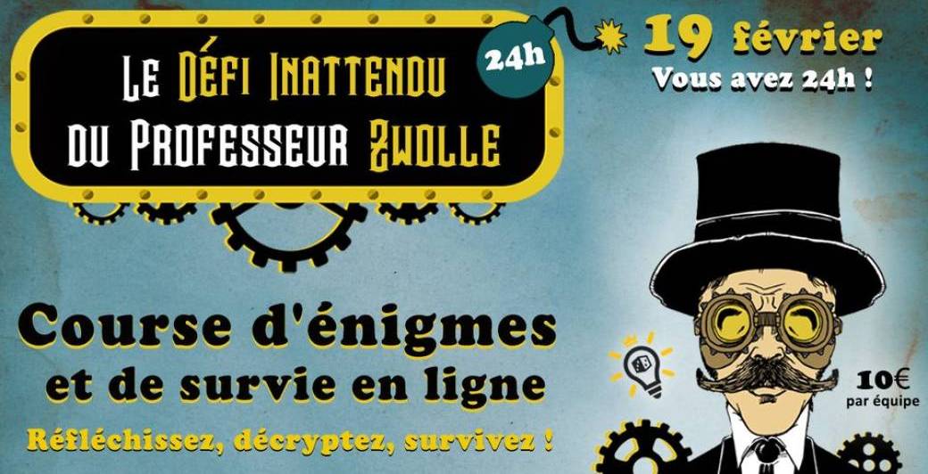 Depuis son laboratoire poussiéreux, le terrible professeur Zwolle crée d’étranges inventions pour dominer le monde. Il vous a concocté une course d'énigmes à résoudre en 24h maximum.