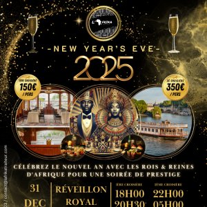 Boissons : 4 coupes de champagne par personne offertes + Vin rouge ou vin blanc ½ bouteille pour 2 + Eau plate (Évian) ou eau pétillante (Badoit) 1 litre pour deux + Café ou infusion ou thé africain