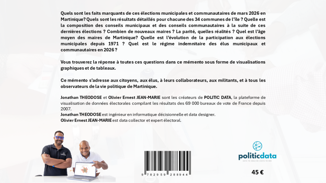 Quels sont les faits marquants de ces élections municipales et communautaires de mars 2026 en Martinique? Quels sont les résultats détaillés pour chacune des 34 communes de l’île ? Quelle est la composition des conseils municipaux et des conseils communautaires à la suite de ces dernières élections ? Combien de nouveaux maires ? La parité, quelles réalités ? Quel est l’âge moyen des maires de Martinique? Quelle est l’évolution de la participation aux élections municipales depuis 1971 ? Quel est le régime indemnitaire des élus municipaux et communautaires en 2026 ?