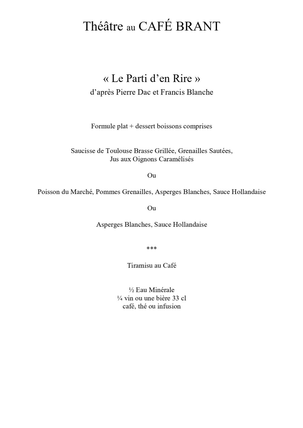 Spectacle vers 20h30 une fois le repas terminé (pas de service pendant la représentation), dans de vraies conditions d'écoute théâtrale de qualité (scène, noir salle, lumière projecteurs) et de partage artistique avec le public.