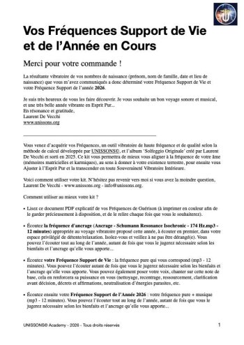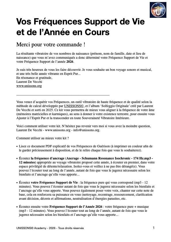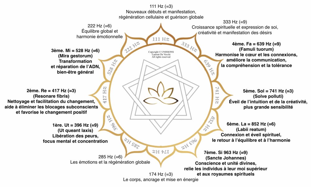 C'est précisément ce pont entre numérologie et sonologie sacrée qui est au cœur de la méthode "Solfeggio Originale" que j'ai créée vers les années 2010 : à partir de la résultante vibratoire de tes nombres de naissance, calculée sur base de tes date et lieu de naissance, il devient possible d'identifier tes Fréquence Support de Vie et celle de l'année en cours parmi les 12 fréquences sacrées du "Solfeggio Originale" (Matrice Vibratoire complète de base 12) — celles-là mêmes redécouvertes par le Dr Joseph Puleo grâce à l'ancienne méthode de Pythagore, et qui forment depuis Guido d'Arezzo au XIe siècle l'ossature du chant sacré universel.