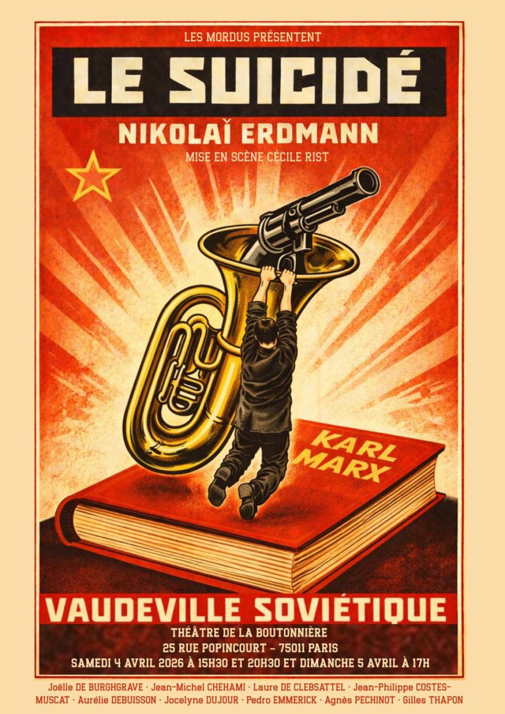 2026-04-04 15:30:00 2026-04-05 18:45:00 Europe/Paris Le Suicidé Reservations on : https://www.billetweb.fr/le-suicide1 -- Une dispute conjugale à propos d'un saucisson dégénère. Semione est un chômeur longue durée, et sa famille comme son entourage, prompts à la panique, craignent qu'il attente à sa vie. Rapidement, ce potentiel suicide attise de tous côtés multiples convoitises. Un Semione mort vaudrait-il plus qu'un Semione vivant ? Depuis ce point de départ, s'enchainent des situations plus cocasses les unes que les autres au point de rendre confus Semione lui-même. Une farce existentielle et politique désopilante ! Théâtre la Boutonnière, Rue Popincourt, Paris, France BordCadre