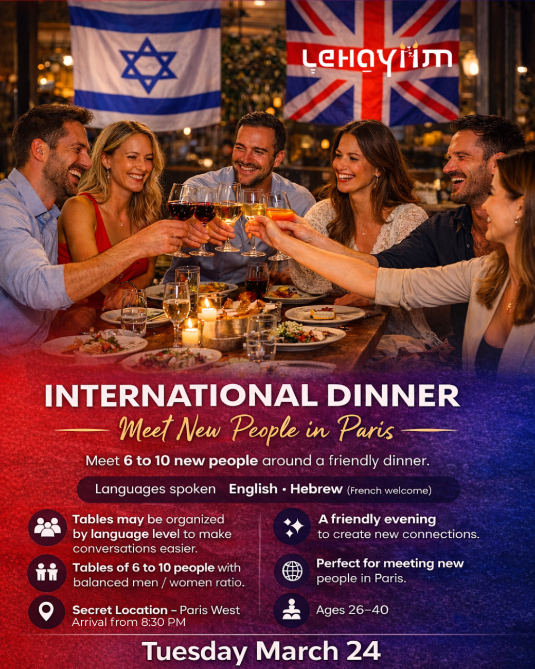 Reservations on : https://www.billetweb.fr/lehayiim-international-diner-tuesday-24-march-26-40-years-old --