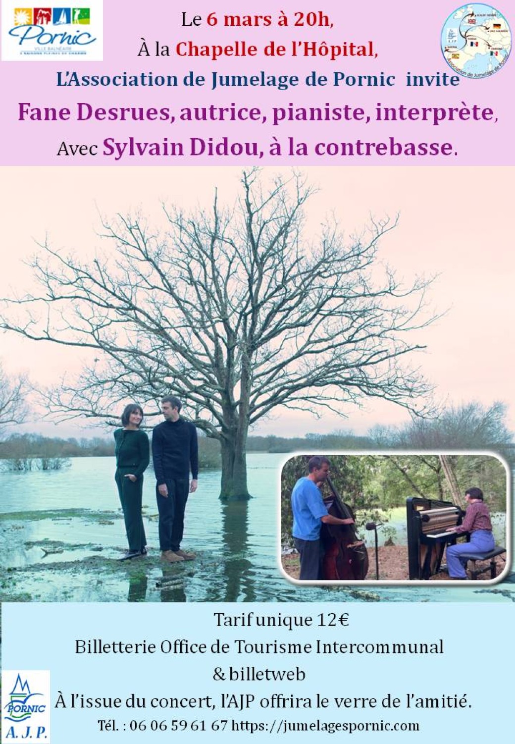 À l’occasion de la Journée des Droits des Femmes, l’Association de Jumelage de Pornic renouvelle son engagement en proposant une soirée artistique et solidaire. Le 6 mars à 20h, à la Chapelle de l’Hôpital, l’AJP accueillera Fane Desrues, autrice-compositrice-interprète, accompagnée du contrebassiste Sylvain Didou, pour un concert sensible et engagé.