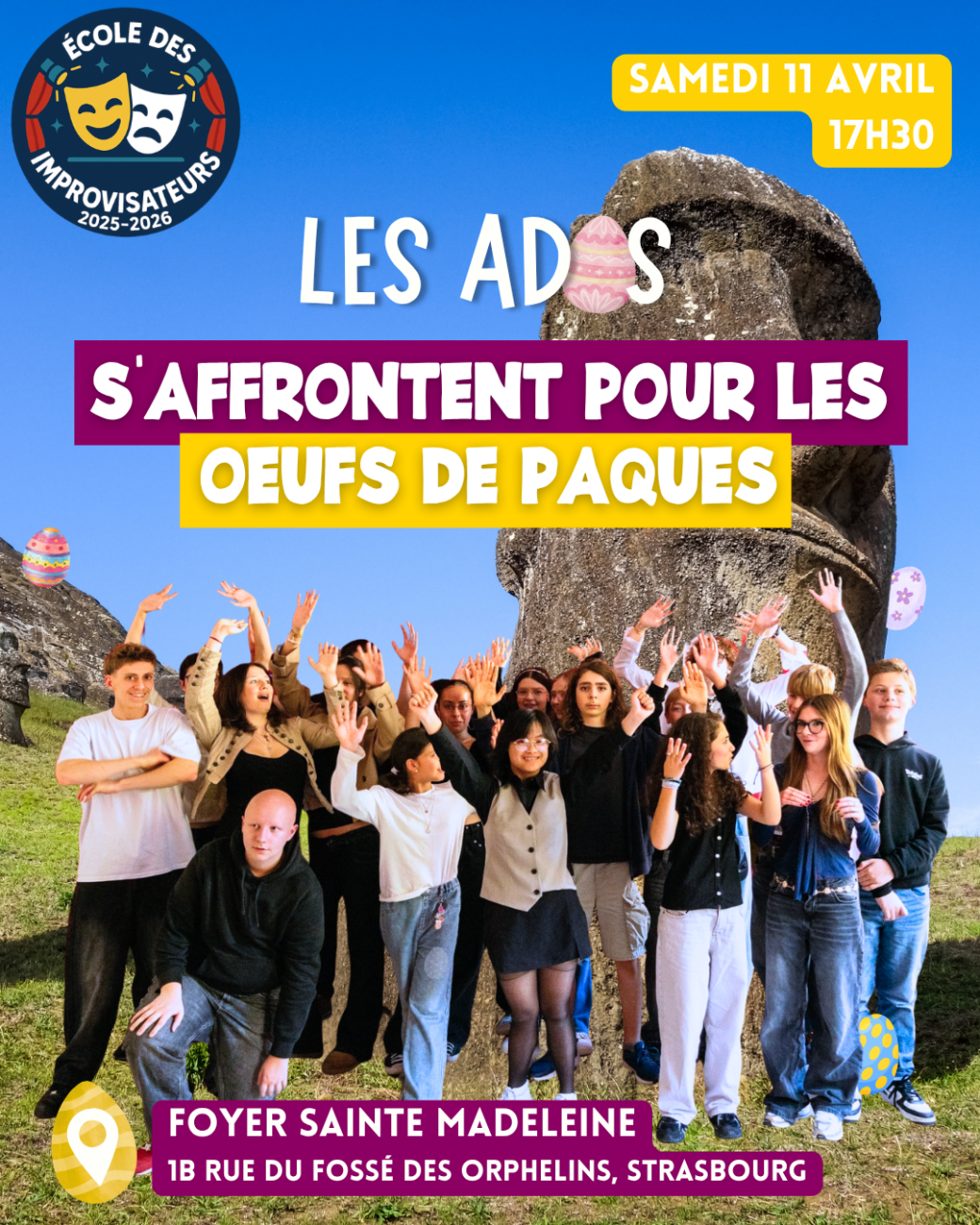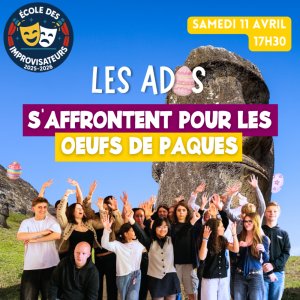 2026-04-11 17:30:002026-04-11 19:30:00Europe/ParisLes ados s'affrontent pour les oeufs de Pâques ! (show d'impro) Reservations on : https://www.billetweb.fr/les-ados-saffrontent-pour-les-oeufs-de-paques-show-dimpro