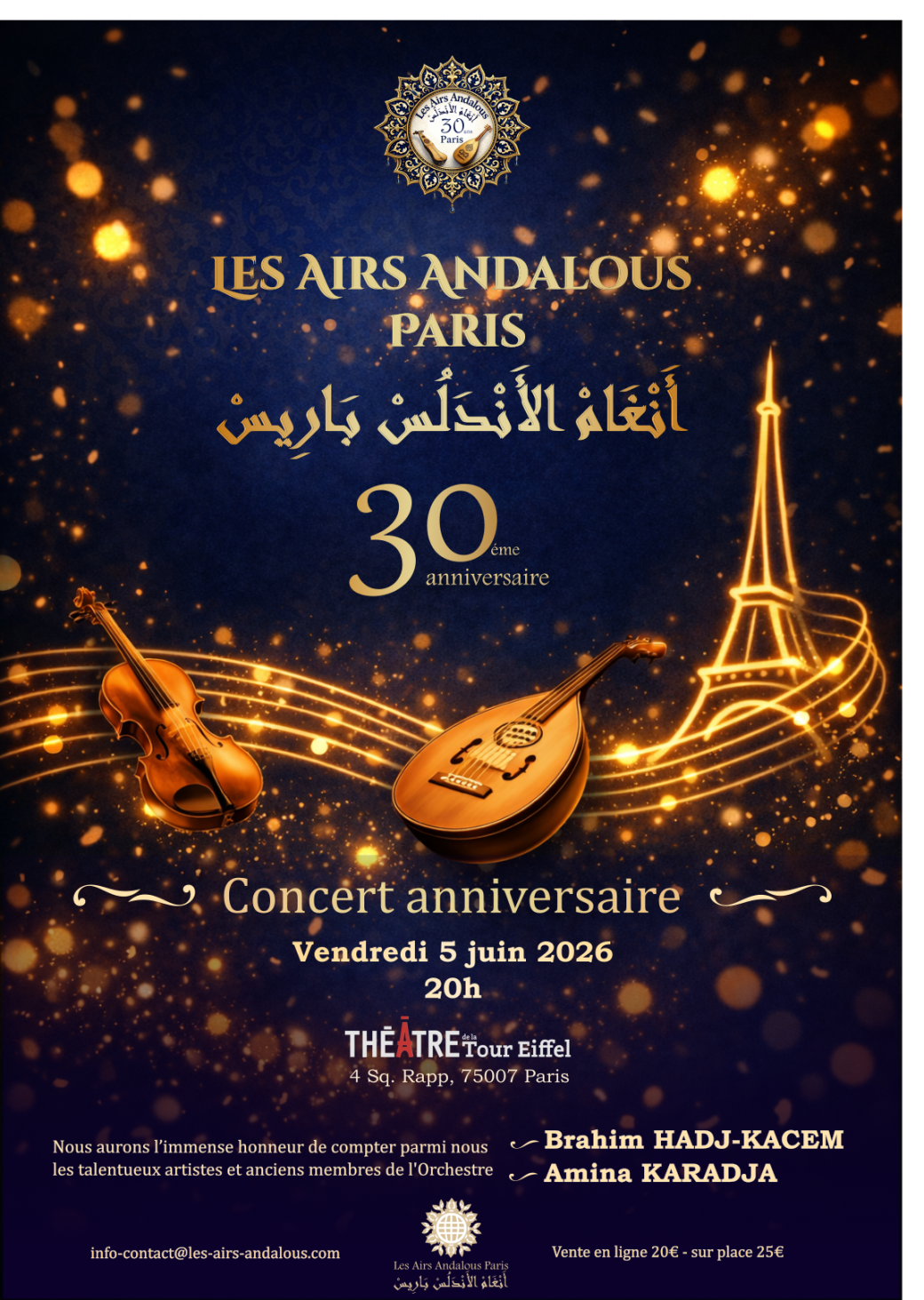 À l’occasion de ses 30 ans, l'association Les Aîrs Andalous Paris a l’immense plaisir de vous convier à un concert anniversaire d’exception, célébrant trois décennies de passion, de transmission et d’héritage musical.