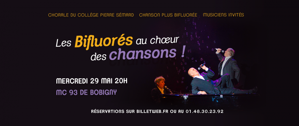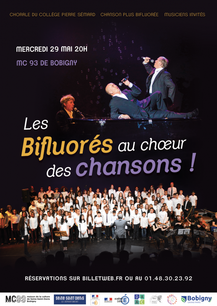 2019-05-29 20:00:00 2019-05-29 21:45:00 Europe/Paris Les Bifluorés au chœur des chansons ! Reservations on : https://www.billetweb.fr/les-bifluores-au-choeur-des-chansons -- Concert événement à Bobigny "Les Bifluorés au chœur des chansons !"Le mercredi 29 mai 2019 à 20h à la MC93 de Bobigny.Après un récent triomphe au Théâtre La Bruyère (Paris) du 11 novembre 2018 au 10 mars 2019, le groupe Chanson Plus Bifluorée joue cette année les "prolongations" à Bobigny pour chanter avec les 140 élèves de la chorale du collège Pierre Sémard. Un groupe de huit musiciens accompagnera cet ensemble pour un spectacle de plus d'1h30 ! Un spectacle à ne rater sous aucun prétexte ! Rires et émotions garantis. Placement libre.Xavier Cherrier - ChantMichel Puyeau - Chant & GuitareSylvain Richardot - Chant et PianoSite web : http://www.chansonplus.frAramis Monroy - Violon 1Jean-Lou Descamps - Violon 2Marie Walter - AltoPauline Walter - VioloncelleChristian Zamuner - ContrebasseJean-Bapstite Cougoul - PianoVincent Gailly - AccordéonTim Hanquet - BatterieChorale du Collège Pierre SémardÉlèves de CM1 et CM2 de l’école Paul ÉluardRomain Lapeyre - DirectionConcert en partenariat av… MC93 - Maison de la Culture de Seine-Saint-Denis, Bobigny, France Association des "Amis de la Classe Musique des Ponts-Jumeaux"