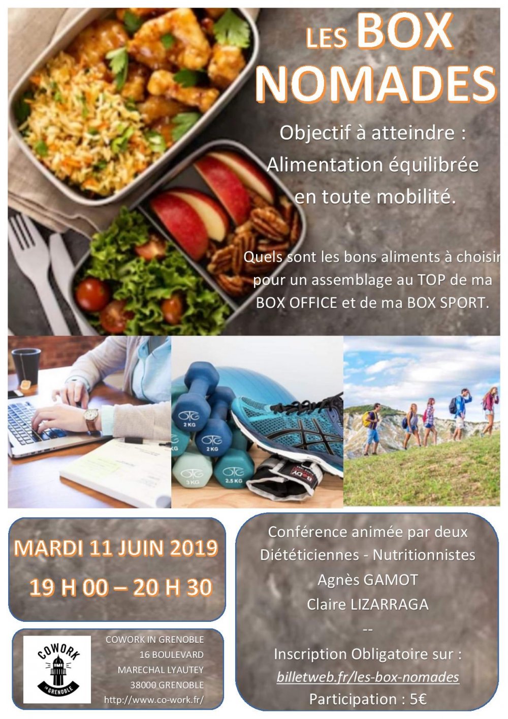 2019-06-11 19:00:00 2019-06-11 20:30:00 Europe/Paris LES BOX NOMADES Reservations on : https://www.billetweb.fr/les-box-nomades -- Deux diététiciennes-nutritionnistes vous présentent des Box maison équilibrées à amener lors de vos déplacements au bureau, en weekend à la salle de sport..A la fin de le l'évènement un présent vous sera offert.  Cowork In Grenoble, Boulevard Maréchal Lyautey, Grenoble, France Collectif DIET