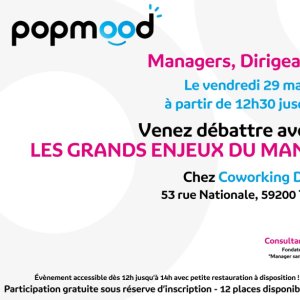 Rejoignez-nous le vendredi 29 mai 2026, de 12h30 à 13h15, pour un débat exclusif sur les grands enjeux du management moderne. Animé par Clara Liagre et Yoann Brouzeng, fondateurs de Popmood et du podcast « Manager sans s’épuiser : trouver l’équilibre », cet échange aura lieu au Co-working District, 53 rue Nationale, 59200 Tourcoing.