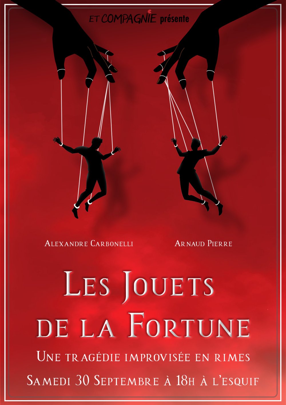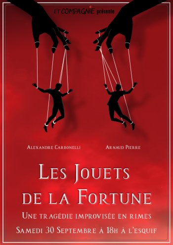 2023-09-30 18:00:00 2023-09-30 20:00:00 Europe/Paris Les Jouets de la Fortune Reservations on : http://www.improetcompagnie.com -- Improviser une tragédie entièrement en rimes, c'est le défi des Jouets de la Fortune. Dans la tradition des pièces de Racine et de Corneille, cette pièce en cinq actes va vous faire suivre la chute inexorable de deux personnages que vous, les dieux du public, aurez maudits.   Alexandre et Arnaud se plongent dans une scénographie changeante pour vous faire vivre un moment de théâtre inédit où vous ferez tourner le premier rouage de la machine du destin.   Durée : 1h   11 Rue du Bon-Pasteur, 69001 Lyon, France ET COMPAGNIE