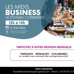2026-04-17 12:00:002026-04-17 14:00:00Europe/ParisLes midis business Lézignan-Corbières - réunion du vendredi 17/04/2026Reservations on : https://www.billetweb.fr/les-midis-business-lezignan-corbieres-reunion-du-vendredi-20-03-20261