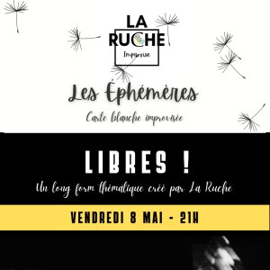 2026-05-08 21:00:002026-05-08 21:00:00Europe/ParisLes Éphémères : Spectacle d'impro unique par la cie La RucheReservations on : http://lesmotsephemeres.fr