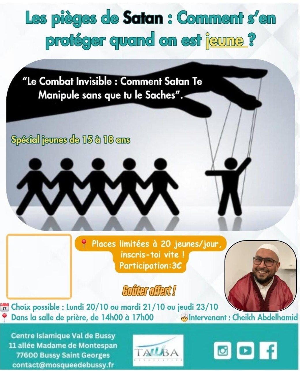 2025-10-20 14:00:002025-10-23 17:00:00Europe/ParisLES PIEGES DE SHAYTAN : Comment s'en protéger quand on est jeune ( 15 à 18 ans)Reservations on : https://www.billetweb.fr/les-pieges-de-shaytan-comment-sen-proteger-quand-on-est-jeune-15-a-18-ans
