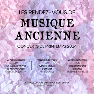 Depuis plus de 10 ans, l’ensemble Céladon organise la saison de concerts Les Rendez-vous de musique ancienne, au sein de la chapelle du lycée Saint-Louis-Saint-Bruno à la Croix-Rousse (Lyon 1), où l’ensemble est en résidence. Son acoustique exceptionnelle et ses dimensions idéales en font un lieu privilégié pour la musique ancienne. Les Rendez-vous de musique ancienne invitent de jeunes ensembles dont les artistes sortent des écoles supérieures de musique, des ensembles amis, des projets de musiciens qui se produisent régulièrement avec l’ensemble Céladon..., avec la volonté de faire vivre et entendre la diversité des musiques anciennes et l’excellence artistique de musiciens et chanteurs de la région et d’ailleurs.