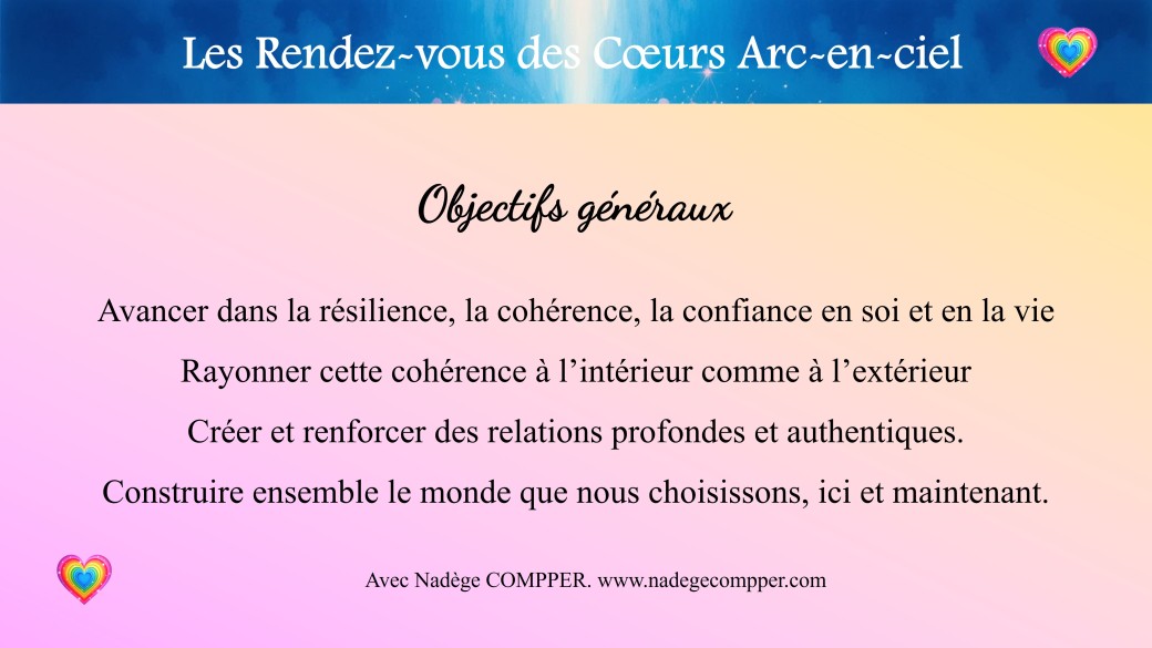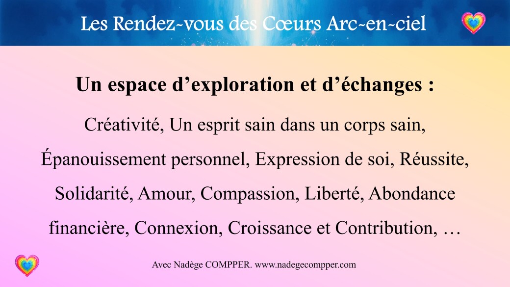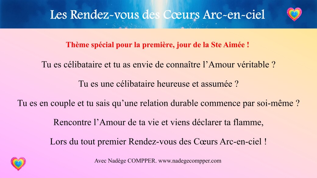 Si tu as besoin de plus d’informations sur Les Rendez-vous des Cœurs Arc-en-ciel, consulte la page dédiée sur le site de Nadège COMPPER (j'espère que tu aimes lire !)