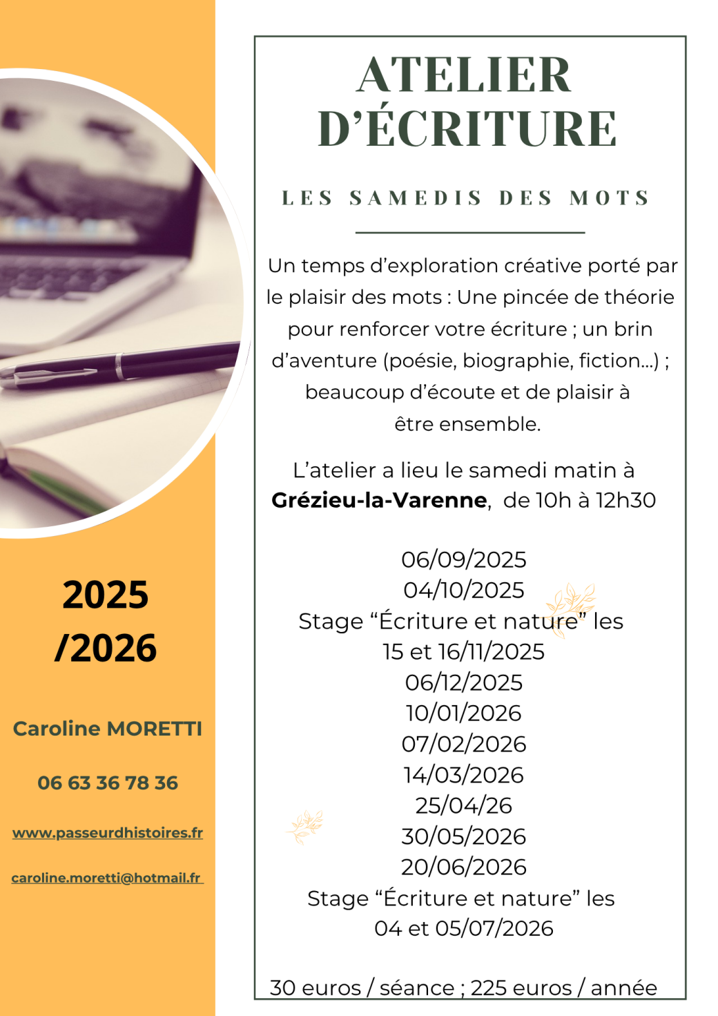 2026-01-10 10:00:00 2026-01-10 10:00:00 Europe/Paris Les samedis des mots Reservations on : https://www.billetweb.fr/les-samedis-des-mots10 -- Que vous poussiez la porte d'un atelier d'écriture pour la première ou la centième fois, je vous accueille pour un temps d'exploration créative porté par les mots. Une dose de théorie pour renforcer votre écriture ; une pincée d'aventure ( poésie, biographie, fiction, qu'explorerons-nous aujourdhui ??) ; beaucoup d'écoute et de plaisir à être ensemble. Je suis à votre disposition si vous avez des questions au 06 63 36 78 36. Dates : 06/09/25 ; 04/10/2025 ; 06/12/2025 ; 10/01/2026 ; 07/02/26 ; 14/03/26 ; 25/04/26 ; 30/05/26 ; 20/06/26.  Week-end "Ecriture et Nature" en Rhône-Alpes les 15 et 16 novembre 2025, ainsi que les 4 et 5 juillet 2026.  Grézieu-la-Varenne, France Caroline Moretti EI