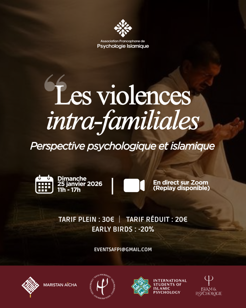 Ce séminaire en ligne, ouvert à tous et organisé par l’Association Francophone de Psychologie Islamique (AFPI), réunit psychologues, neuropsychologue, imam et avocate autour d’un regard croisé entre psychologie clinique, neurosciences, droit et sciences islamiques. Il vise à mieux comprendre les mécanismes des violences intrafamiliales, leurs impacts psychiques et neurobiologiques, ainsi que les enjeux spécifiques et peu abordés des abus spirituels.