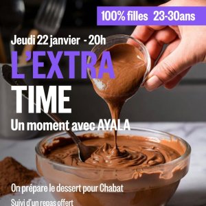 2026-01-22 20:00:00 2026-01-22 21:00:00 Europe/Paris L'extra Time avec Ayala - Recette mousse au chocolat Reservations on : https://www.billetweb.fr/lextra-time-avec-ayala-recette-mousse-au-chocolat -- L'extra Time - Un moment avec Ayala  On se régale en préparant les gourmandises pour Chabbat : chocolat en folie ! Parce que Chabbat, ça se prépare avec douceur et plaisir ! 23-30 ans  Places limitées ! Inscription obligatoire : olami-cadet-nation.fr Centre Olami Cadet  Olami Cadet Olami Cadet