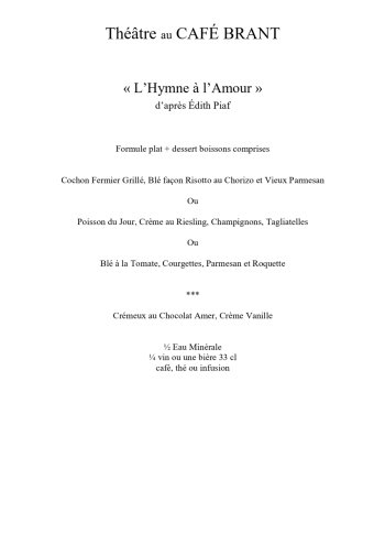Spectacle vers 20h30 une fois le repas terminé (pas de service pendant la représentation), dans de vraies conditions d'écoute théâtrale de qualité (scène, noir salle, lumière projecteurs) et de partage artistique avec le public.