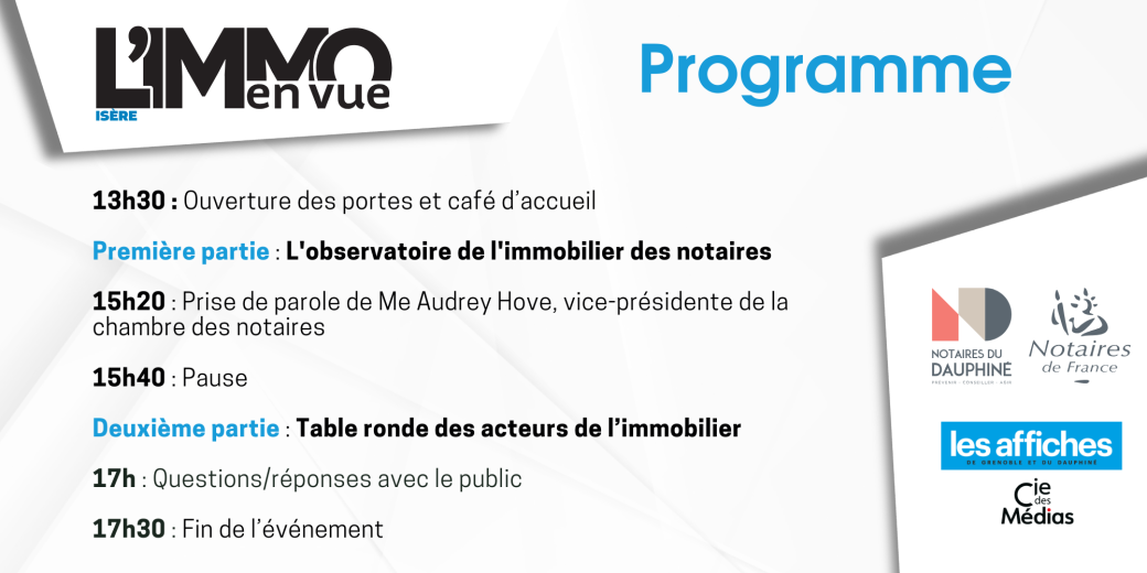 L'observatoire de l'immobilier des notaires de l'Isère et la table-ronde de l'immobilier se dérouleront conjointement le mardi 5 mai 2026 à 13h30 à la Chambre Interdépartementale des Notaires du Dauphiné (10 rue Jean-Moulin 38180 Seyssins).