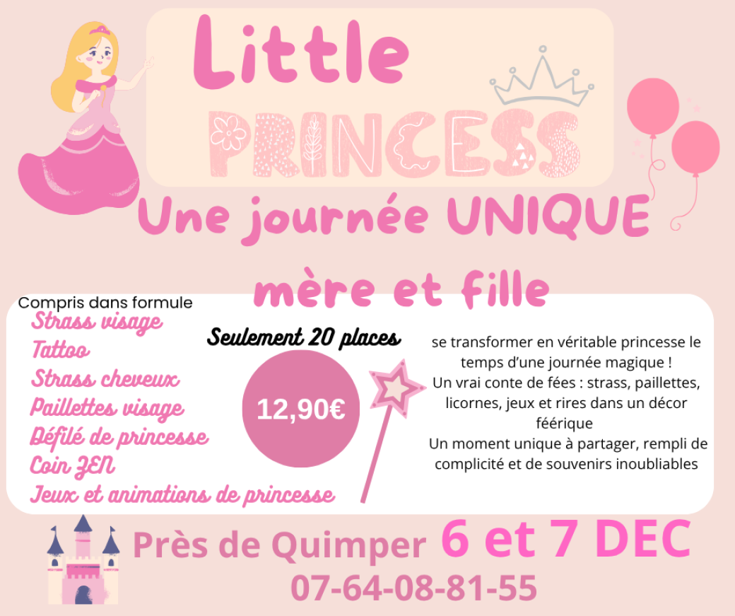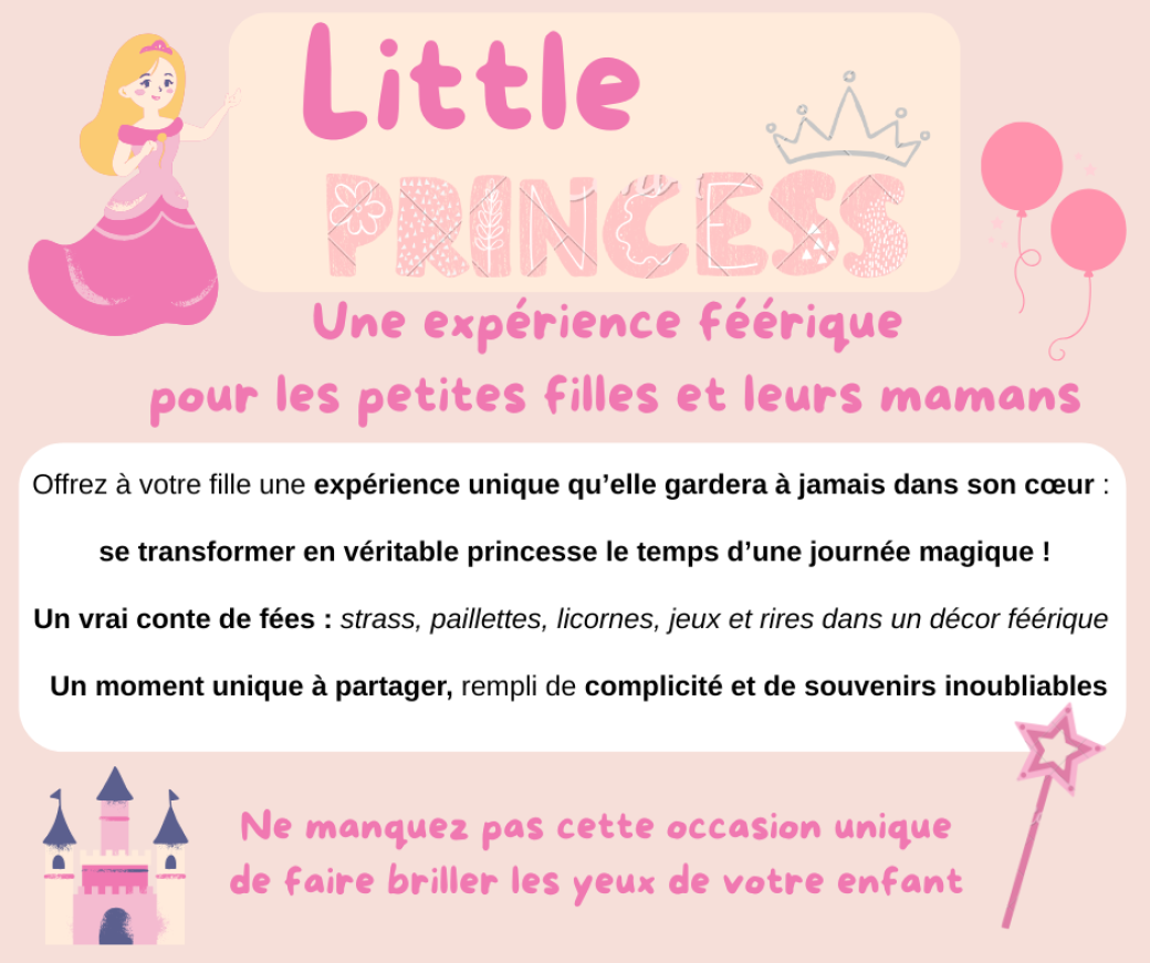 Au fil des ateliers, votre petite princesse se pare de strass, de couleurs et de sourires… et vous partagez avec elle des moments uniques, complices et inoubliables.