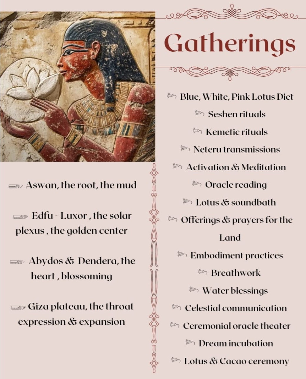 This is an invitation to walk the golden path, to step into the mystery of the sacred land of Kemet, ancient Egypt, an invitation to cross the portal of ancient wisdom and connect to the origin through the diet with the 3 lotuses.