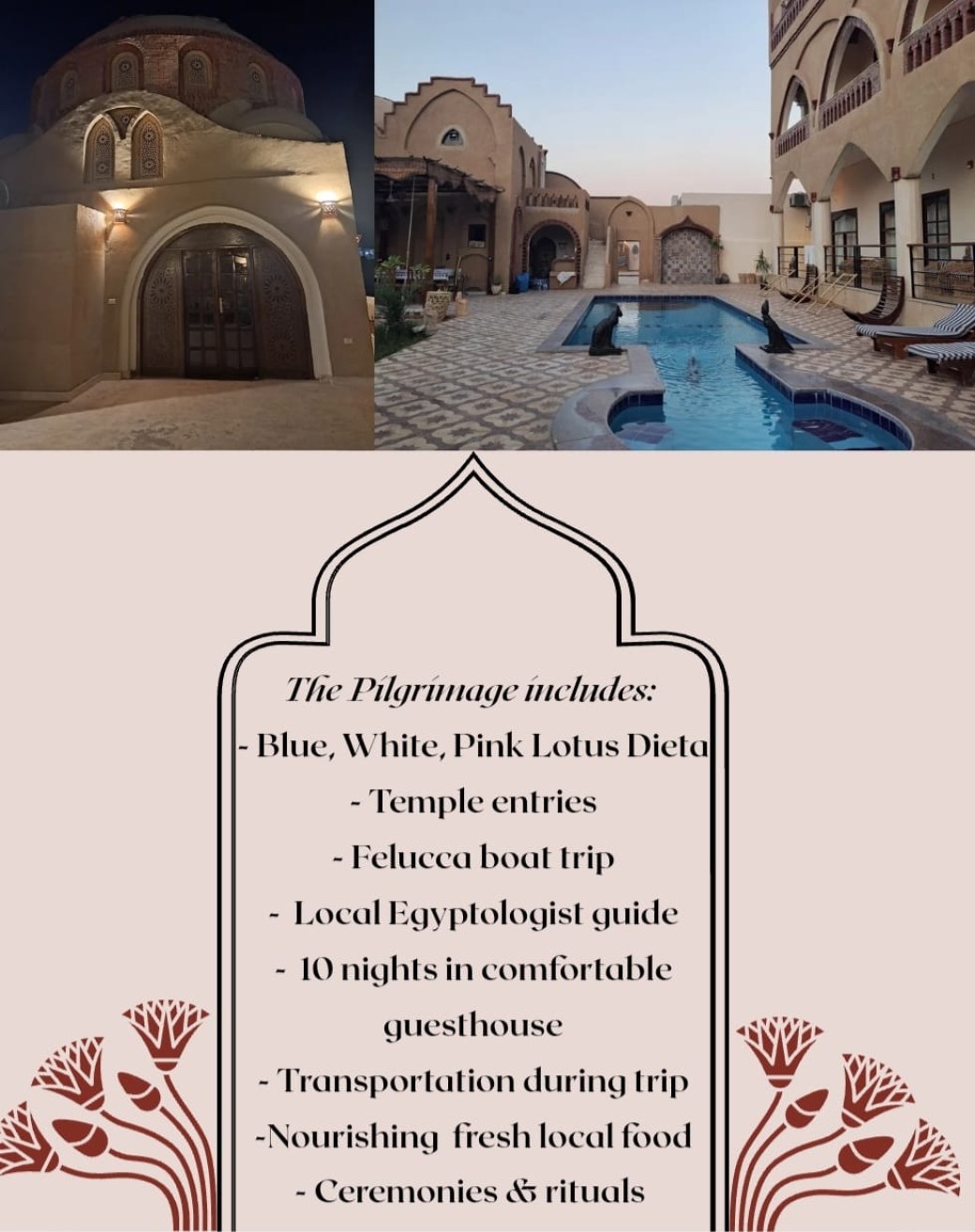 This Pilgrimage is a journey of initiation and rememberance. Initiation by the land itself, where we will visit powerfull temples all aligned with differents stars constellations along the holy water, the Nile, reflecting the beauty and the mystery of the Sky.