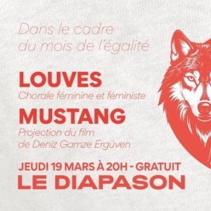 2026-03-19 20:00:00 2026-03-19 23:00:00 Europe/Paris LOUVES + MUSTANG Reservations on : https://www.billetweb.fr/louves-mustang --   LOUVES Concert // Chorale féminine & féministe Louves c’est, au départ, une bande de copines qui veulent apprendre des chants féministes ensemble. Petit à petit, son esprit sororal parcourt Rennes jusqu’à la formation d’une chorale informelle et inclusive. Menée par la cheffe de chœur improvisée Ellie James (La Battue, Mermonte), Louves partage cet engagement teinté d’émancipation via un répertoire allant de Niagara à Bikini Kill, en passant par les chants traditionnels bretons et l’hymne du MLF.   MUSTANG  Projection // Un film de Deniz Gamze Ergüven C'est le début de l'été. Dans un village reculé de Turquie, Lale et ses quatre sœurs rentrent de l’école en jouant avec des garçons et déclenchent un scandale aux conséquences inattendues. La maison familiale se transforme progressivement en prison, les cours de pratiques ménagères remplacent l’école et les mariages commencent à s’arranger. Les cinq sœurs, animées par un même désir de liberté, détournent les limites qui leur sont impos… Le Diapason, Allée Jules Noël, Rennes, France Service Culturel - Université de Rennes