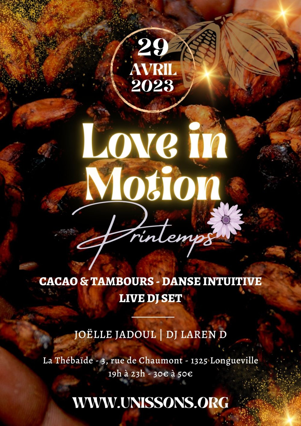 2023-04-29 19:00:00 2023-04-29 19:00:00 Europe/Paris Love in Motion (Cacao, Tambours & Danse Intuitive, Live Dj Set) - Printemps Reservations on : https://www.billetweb.fr/love-in-motion-cacao-tambours-danse-intuitive-live-dj-set-printemps -- !!SOLD OUT!!    L'Amour que nous portons en nous s'offrira au monde et à la Vie en ce printemps nouveau, par le Mouvement induit par le Cacao Cérémonial, le Tambour Chamanique tout en douceur, la Danse Sensible & Intuitive, la Musique sélectionnée et mixée en Live par Dj Laren D...   Amenez votre MUG + votre tAMbOUR et des vêtements souples ! (Il n'y en aura pas à disposition sur place).   Evénement limité à 30 personnes !   Le Cacao, également connu sous le nom de "chocolat cru", est une médecine végétale sacrée sud américaine célébrée comme «la nourriture des dieux». Depuis des centaines d'années, le cacao est utilisé dans des cérémonies à caractère "chamanique" par les indigènes d'Amérique centrale et du Sud.Le Cacao brut est considéré comme un "superfood" et possède la plus grande source de magnésium au monde. Il contient également une "Grâce" qui permet a notre cœur de se développer, de s'ouvrir et rayonner, de favoriser la clairvoyance émotionnelle et d'approfondir notre connexi… Rue de Chaumont 3, Longueville 1325 Chaumont-Gistoux, Belgique UNISSONS©
