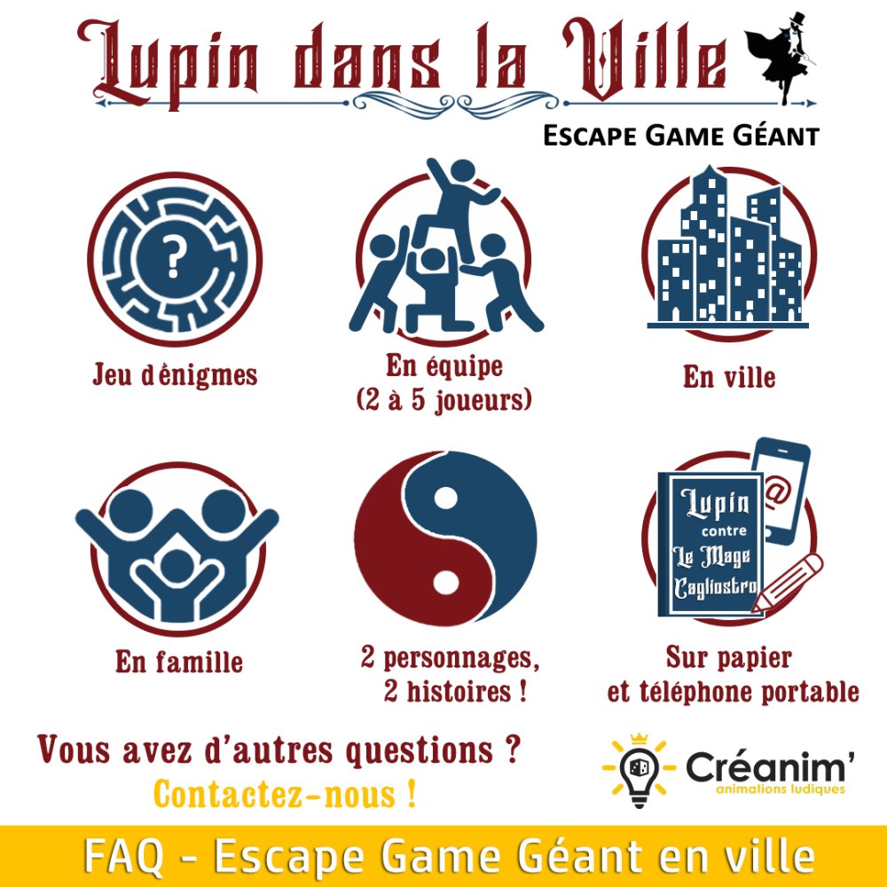 Lupin dans la ville est un escape game géant. Regroupez-vous en équipe de trois à cinq joueurs et joueuses*, partez à l'aventure avec votre smartphone et de votre livret de jeu et résolvez les énigmes dispersées dans le centre-ville. Vous devrez choisir votre camp : Arsène Lupin ou le Mage Cagliostro.
