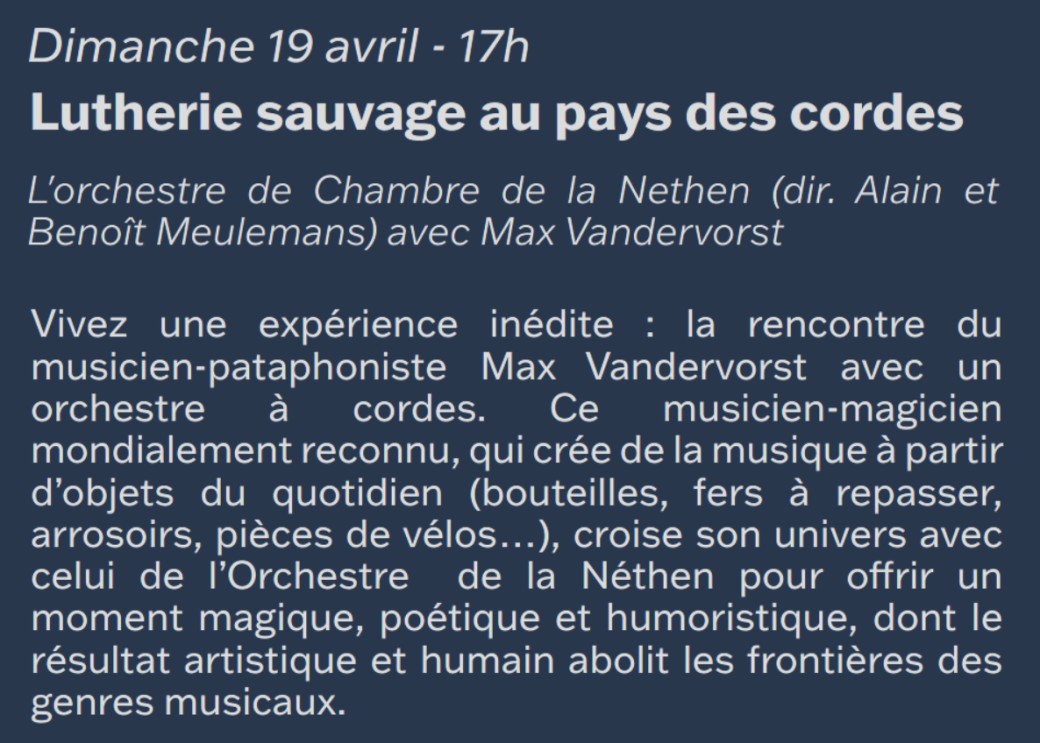 2026-04-19 17:00:002026-04-19 18:00:00Europe/BrusselsLutherie sauvage au pays des cordes - L'orchestre de Chambre de la NethenReservations on : https://www.billetweb.fr/lutherie-sauvage-au-pays-des-cordes