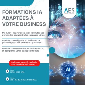 2026-04-20 08:25:00 2026-05-11 12:30:00 Europe/Brussels Maîtriser l’IA en 12 heures : de ChatGPT à votre propre charte IA ! Reservations on : https://www.expertise-strategique.be/ -- En trois demi jours, apprenez à maîtriser l'Intelligence Artificielle pour gagner en autonomie et développer vos compétences !   Les lundis 20/04, 27/04 et 11/05 2026 de 13h30 à 17h30 à Mons !   Venez nous rejoindre pour trois demi journées passionnantes dédiées à l'intelligence artificielle! Notre événement en présentiel se déroulera à Rue des Archers 4 à Mons. Vous apprendrez tout sur l'IA, de ChatGPT-5 à la création de votre propre charte IA. Ne manquez pas cette occasion unique d'approfondir vos connaissances en matière d'IA en seulement 12 heures! Réservez votre place dès maintenant.   Pourquoi participer ? Cette formation a été spécialement conçue pour les entrepreneurs, cadres et responsables souhaitant : Gagner en autonomie pour améliorer et optimiser leurs prompts. Comprendre les bases de l’IA et ses implications pour les entreprises. Apprendre à utiliser des outils comme ChatGPT et à créer vos propres GPT's. Créer des contenus performants et des visuels de qualité grâce… Rue des Archers 4, Mons, Belgique AES
