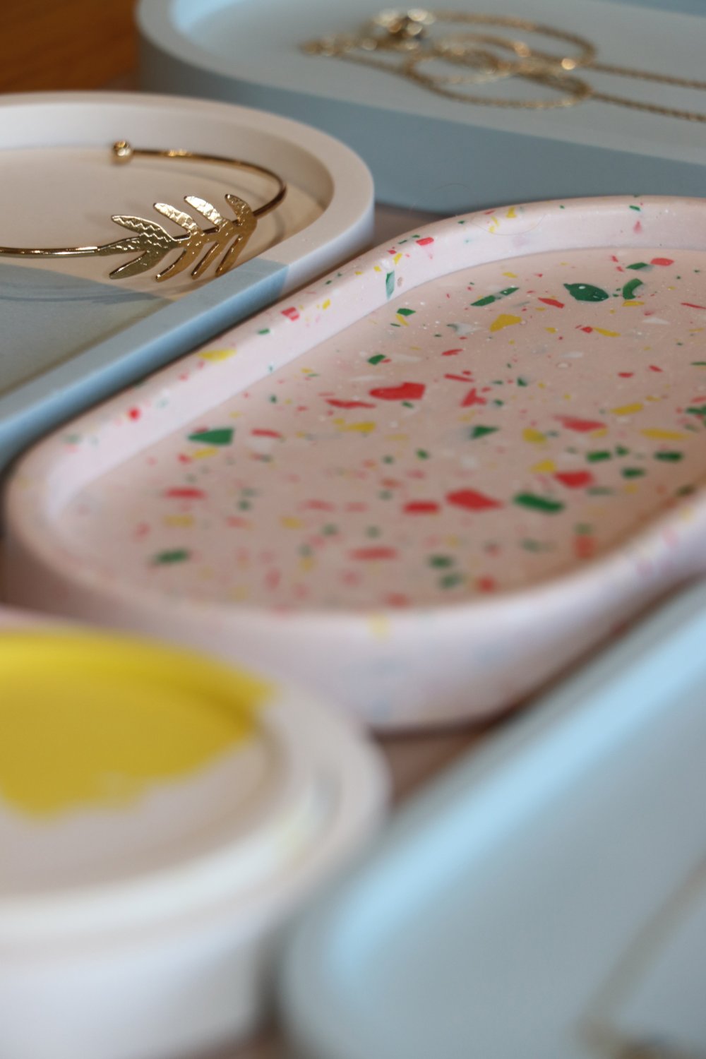 Pendant cet atelier de 2h30, vous vous familiariserez avec la matière, calculerez les bons dosages (parfois un peu complexes), mixerez les pigments, releverez vos manches pour les mélanges et les étapes de poncage... pour réaliser 2 coupelles vides-poches à votre goût.