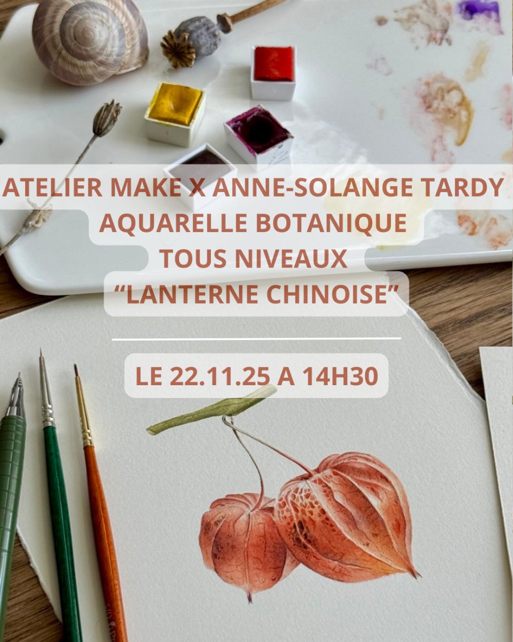 2025-11-22 14:30:00 2025-11-22 17:00:00 Europe/Paris MAKE x A.S.TARDY | Aquarelle Botanique | LANTERNE CHINOISE Reservations on : https://www.billetweb.fr/make-x-a-s-tardy-aquarelle-botanique-la-citrouille1 -- Une lanterne chinoise... aussi vraie que nature !  Ravie de pouvoir vous proposer un nouvel atelier d'aquarelle botanique avec la talentueuse ANNE-SOLANGE TARDY !  Au cours de cet atelier, vous serez initiée aux techniques de bases de l’illustration botanique à travers la peinture d'un classique des jardins d'automne.  Trois heures que vous n’aurez pas le temps de voir passer : humide sur humide, humide sur sec, aquarelle sèche, mélange des couleurs… vous serez guidés pas à pas à chacune de ces étapes par Anne-Solange Tardy, artiste botanique qui vous vous enseignera les subtilités de l'aquarelle réaliste. Bonne nouvelle, cet atelier est ouvert à tous ! Vous pouvez participer même si vous n’avez jamais tenu un pinceau de votre vie et si vous n’avez aucune connaissance en dessin, ni en peinture. (oui, oui, croyez-nous :-) Tout le matériel est fourni, mais n’hésitez pas à venir avec le vôtre si vous le souhaitez. Vous pourrez ainsi discuter de votre équipement avec Anne-Solange. Durée d… MAKE, 30 rue Saint Patern, 56000 Vannes MAKE Vannes