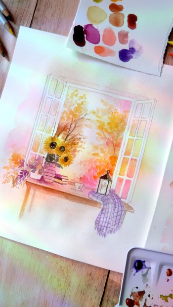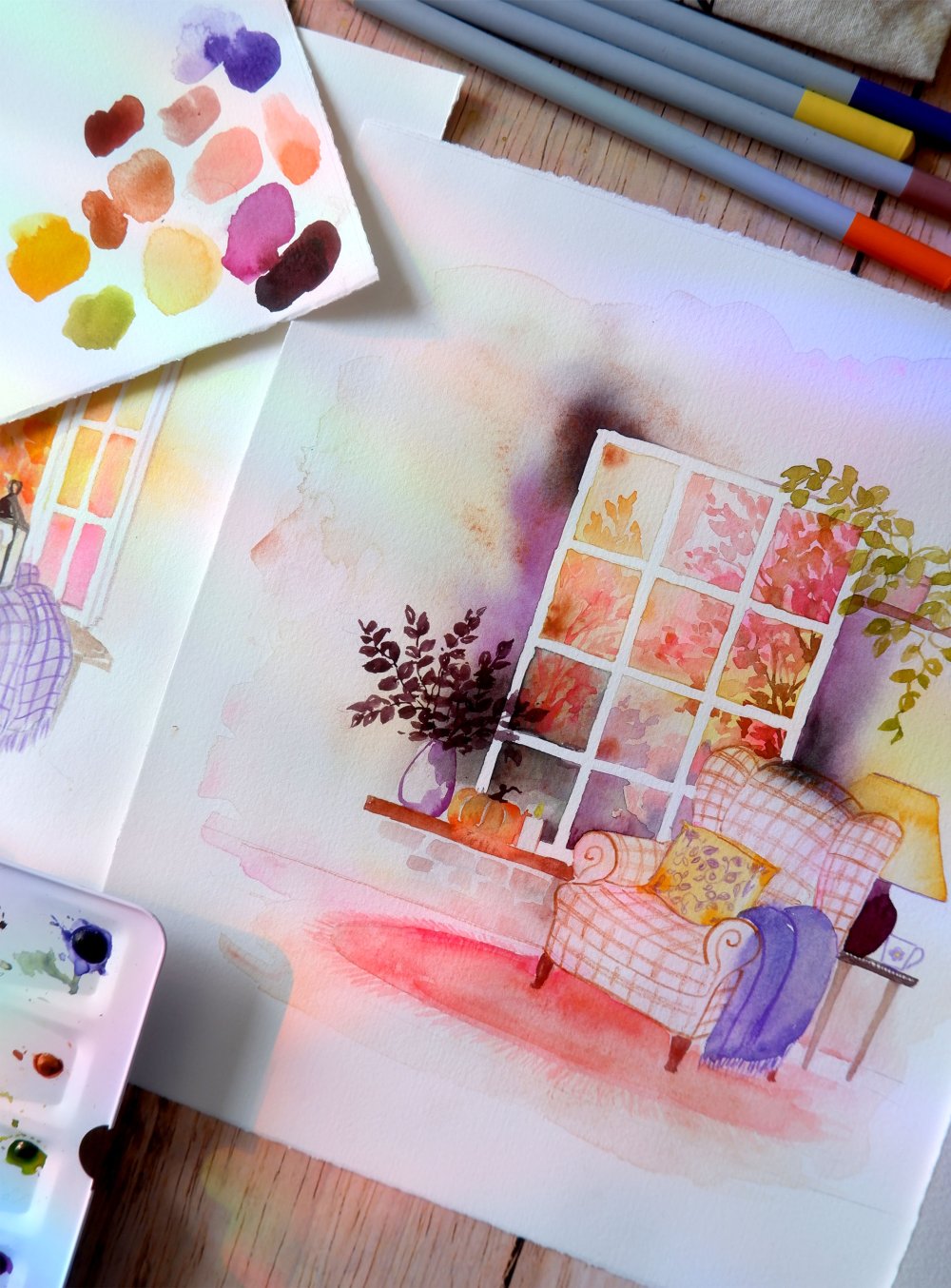 Venez plonger dans l'univers de L'eaubleue avec cet atelier autour de l'automne, un de grands sujets de prédilection de tous les aquarellistes ! Un focus : "Les fenêtres cosy"