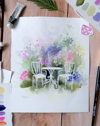Un salon de jardin tout en fluide de masquage et un décor à l'aquarelle fleuri, frais et harmonieux. Un sujet plaisant et personnalisable, avec une technique originale tout en réserve de blanc. Blanche vous montrera ses techniques et vous guidera pas à pas.
