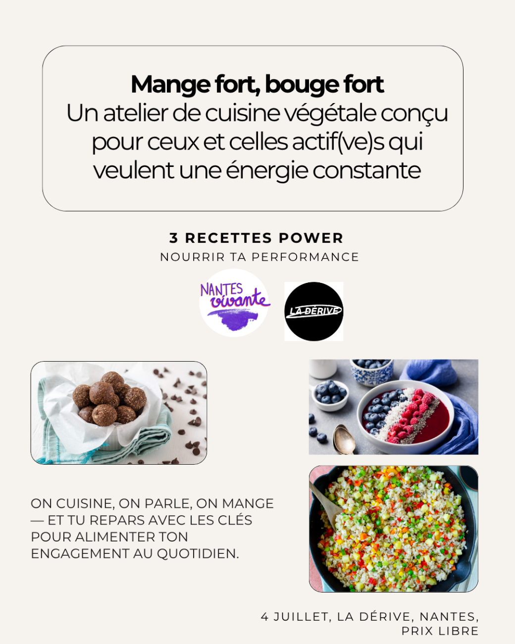 On apprend, on cuisine, on partage, on mange — et tu repars avec les clés pour alimenter ton engagement et tes activités sportives. Parce que prendre soin de toi, c'est aussi une forme de résistance.
